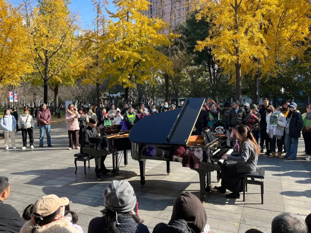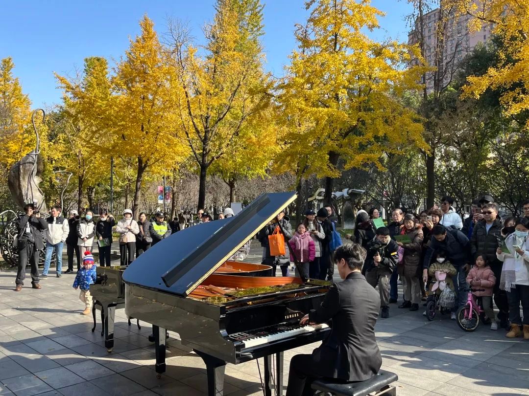 银杏叶随着两台钢琴演奏出的乐曲翩然飘落,市民们晒着冬日的暖阳,视线所及的雕塑作品充满艺术气息,脑海中想象出了波光粼粼的湖面和成群结队的动物……