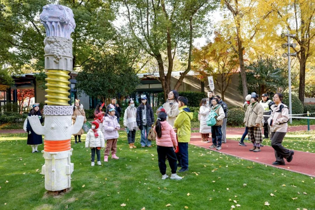 在特别亲子导览“动物王国”中,孩子们戴上动物面具,跟随法语译者、播客「跳岛 FM」策划人何润哲的讲解,踏上一段奇趣的艺术探索之旅。他们在公园各个角落寻找充满生命力的动物雕塑,了解多位法国雕塑家的作品背后的文化艺术传统,以及其中对自然与艺术的深刻理解。