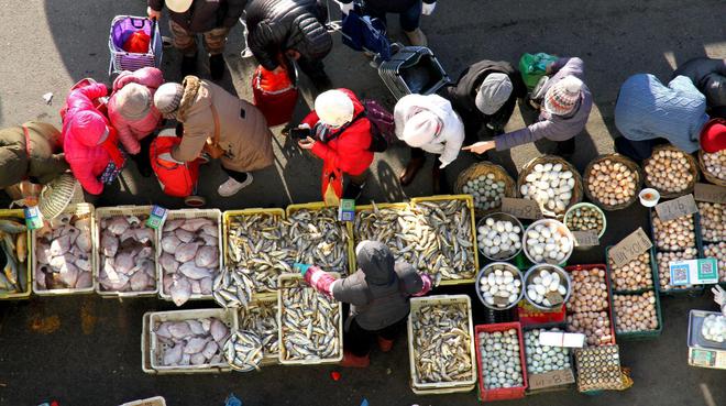1月1日元旦,恰逢沙子口大集。记者在现场看到,大集内的叫卖声不绝于耳,商品琳琅满目,1000多个摊位让你挑花了眼。据悉,沙子口大集至今已有近百年历史,传承了几代人的记忆。图为赶大集的市民正在选购海鲜和鸡蛋。