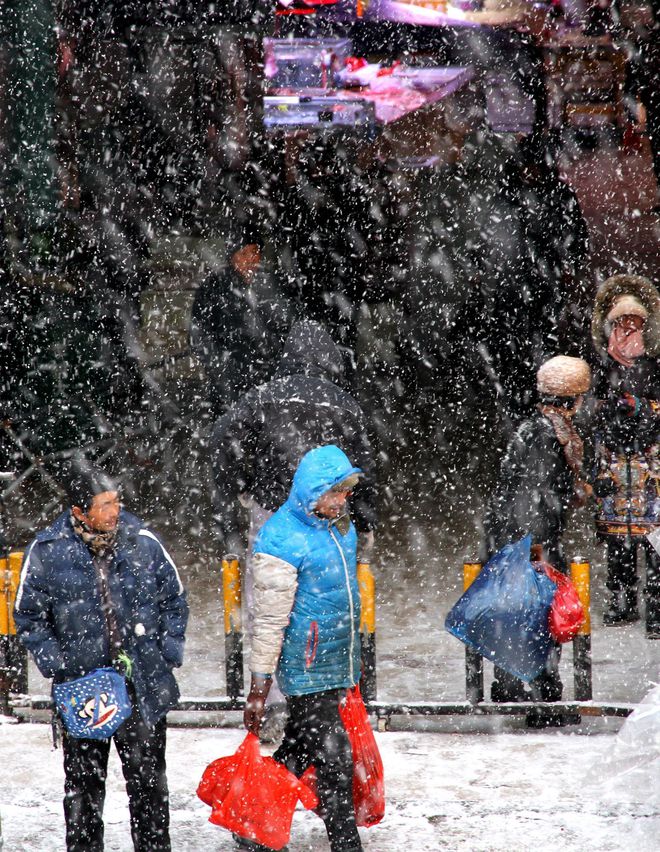 1月22日,青岛迎来2024年首场大雪,飞雪飘飘洒洒,漫天飞舞。市场上购买年货的市民在柳絮般的雪花中行走,勾勒出一幅动人的生活画卷。
