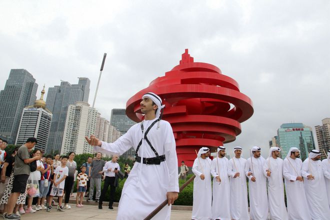 7月19日,五四广场“五月的风”雕塑前,精彩的阿联酋传统舞蹈让市民过足了眼瘾。7月19日至21日,庆祝阿联酋和中国建交40周年青岛站活动在国际会议中心拉开帷幕,这场为期三天的庆祝活动让岛城市民感受到独特的异域风情。