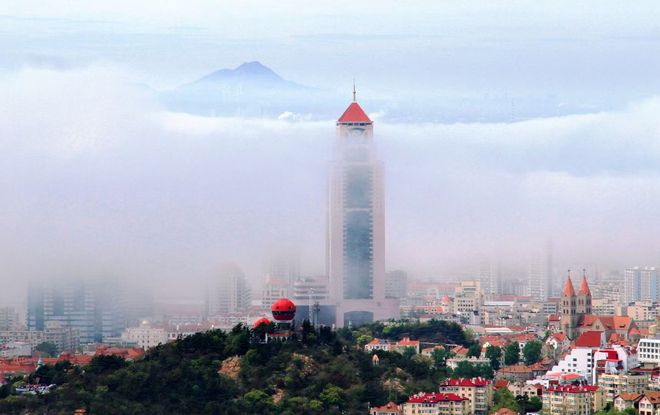 4月28日上午,青岛迎来今春首场超低空平流雾奇观,城市建筑物在雾中若隐若现,恍若人间仙境,让人们感受到大自然的神奇与美妙。