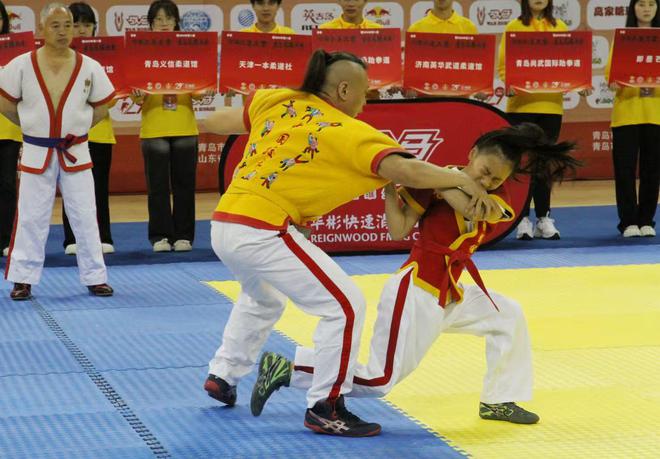 4月27日,国内摔跤网红“小钢炮”父女俩正在表演中国式摔跤。当天,2024首届中国武道大会暨第八届青岛武博大会在青岛市民健身中心体育馆举行,共千余名运动员参与了柔道、摔跤、跆拳道、柔术等11个项目的比赛和展演。
