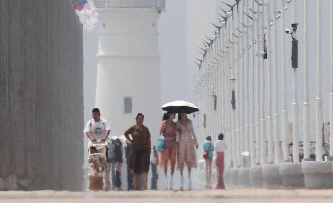 7月13日,随着连续几天降雨的结束,岛城迎来36℃高温天气。图为奥帆中心情人坝上,高温下的路面被蒸汽笼罩形成倒影。