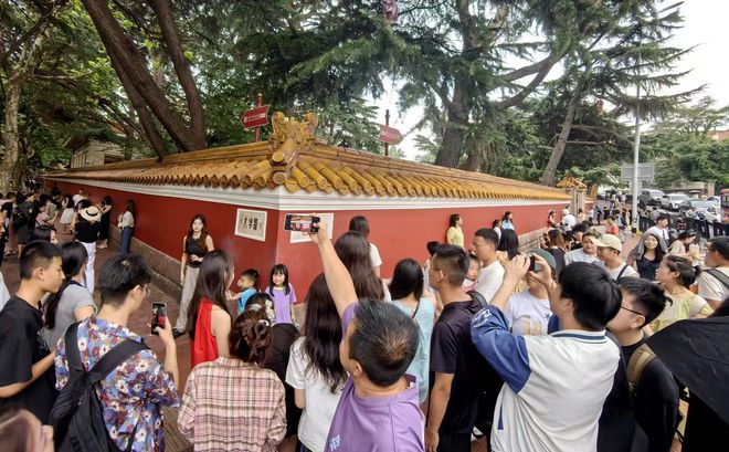 8月2日,随着旅游旺季的到来,大学路“网红墙”成了热门打卡点,每天吸引游客万余人。大学路“网红墙”有着北京故宫墙壁的建筑风格,黄色与红色的搭配显得威严而不失庄重。前来打卡的大多是外地年轻游客,专程来此感受青岛老城的文化和转角遇到爱的浪漫气息。