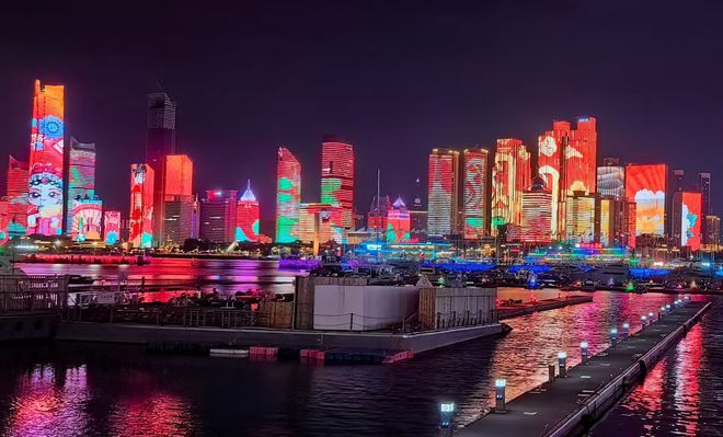 10月1日晚,国庆主题灯光秀点亮浮山湾,沿线楼宇化身“夜青岛”的恢宏画布,以灯光串起璀璨夜色,营造出喜迎国庆的欢乐祥和氛围。