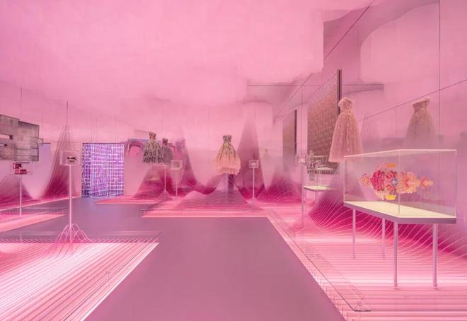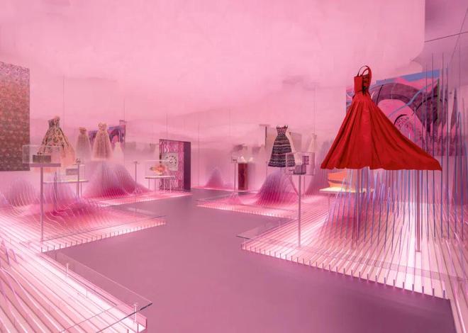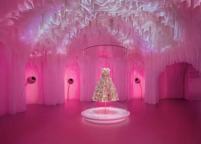 《迪奥小姐展览:芳踪絮语》以香气为引,回溯品牌香氛艺术的历史脉络,馥郁的核心香调经由嗅觉装置绽放,加上一系列高级订制礼服臻作与艺术作品,梦幻旖旎,串联起“缎影寻踪”“花园絮语”“芳源绮境”“摩登时代”“艺术工坊”“珍藏宠爱”六大展厅。