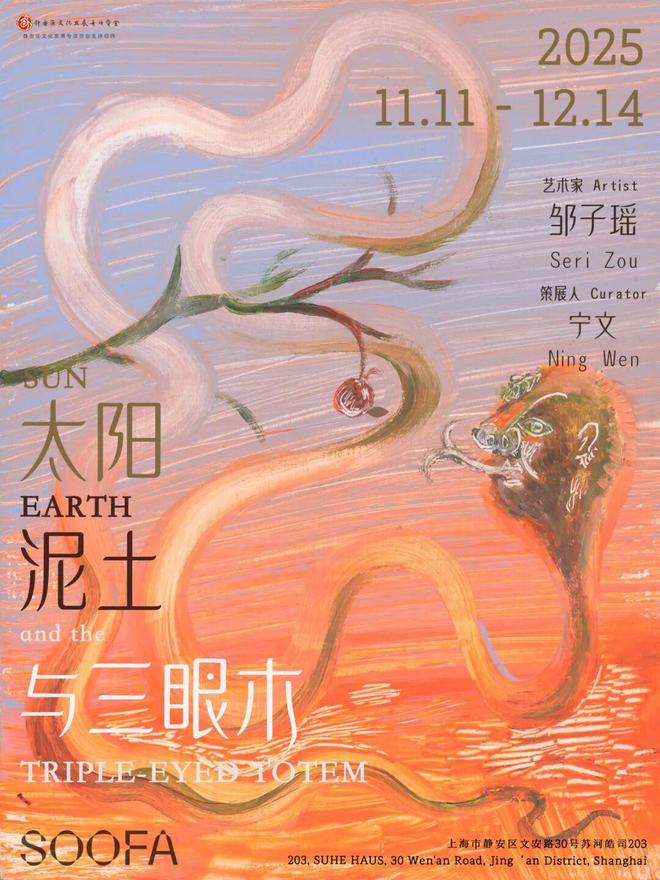 11月11日至12月14日,邹子瑶个展“太阳,泥土与三眼木”在上海SOOFA SUHE展出,宁文担任策展人。展览集中呈现艺术家2024年至2025年创作的绘画、陶瓷与木雕作品,构建出一场以材料为精神载体的视觉探索,连接着古文明的神秘与当下的精神诉求。