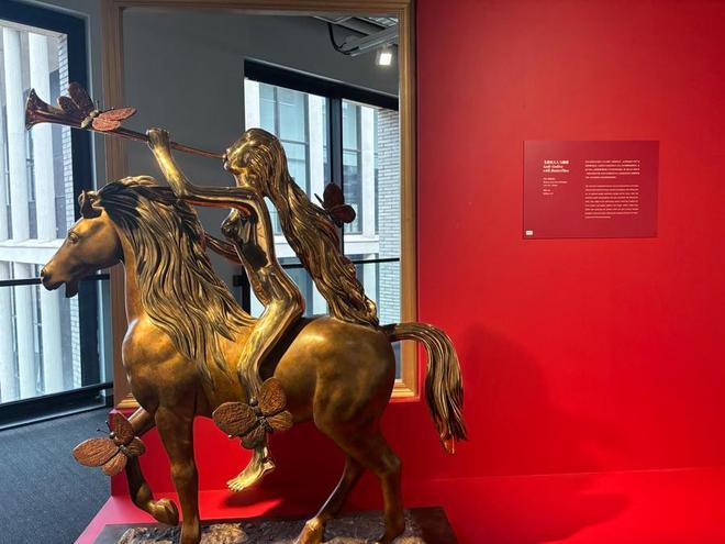 策展团队特别设计“由上至下”的观展动线,步入四楼展厅,率先映入眼帘的是雕塑作品《戈黛娃夫人与蝴蝶》,以青铜肌理呈现戈黛娃夫人的蜕变与勇气。