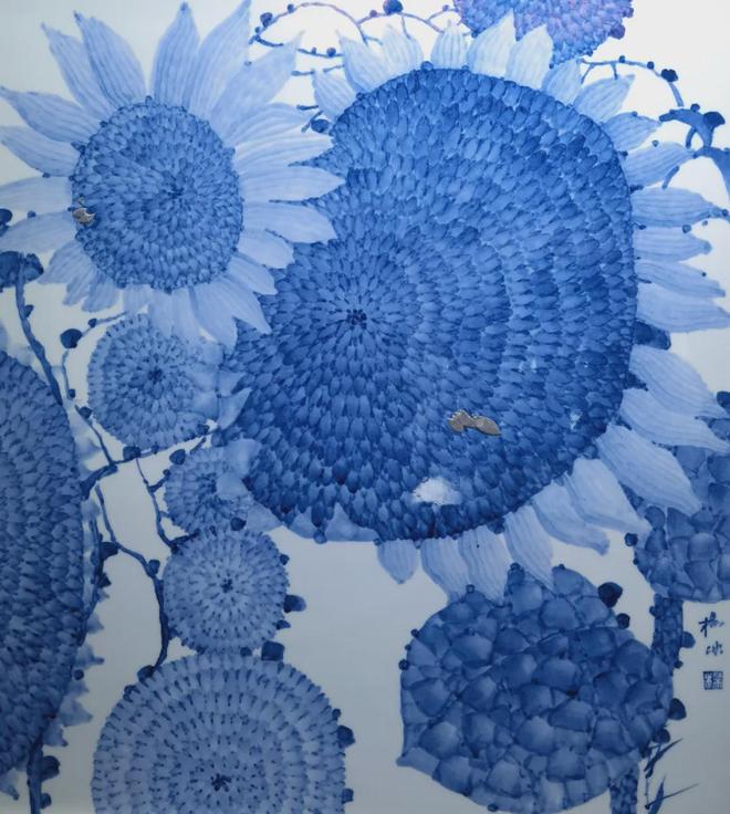 而杨冰的葵,名为“蓝色太阳”,其内核是“沉静的生长”。她以最冷静、最幽深的青花蓝,来表现最热烈、最光明的向日葵与太阳,这本身就是一种极具东方哲思的意象转换。太阳是至阳至刚的,她却以至阴至柔的蓝来承载;向日葵本是追逐太阳的臣民,她却将其升华为太阳本身,这是一种“物我两忘”“天人合一”的境界升华。