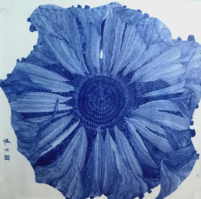 她的画,主题永远是“明亮与清澈、积极与向上、欢乐与舒展”。她笔下的花卉,无论是盛放的葵,还是待放的荷,都豪放大气而无霸悍之气,舒展自如而无轻浮之态。那看似“炸裂”的花瓣,喷涌而出的并非狂躁,而是生命本然的欢畅与热情,如同地心深处“惊天动地喷泻的岩浆”,最终凝结成的却是蓝宝石般璀璨而沉静的美。这是一种经过淬炼的、升华了的生命激情。