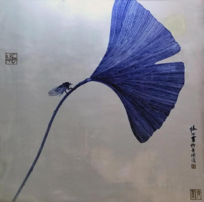 当她面对素白瓷板,脑海中浮现的并非传统花鸟画的婉约填充,而是版画式的构成意志。看她的代表作《银杏》,便可窥见这“筋骨”之强健。画面右上方,银杏枝叶以浓密的青花点层层叠加,形成一片“密不透风”的蓝色云团,仿佛将整个秋天的重量都凝结在了釉下;而左侧,她则毅然“留白”,仅以纤纤枝干斜曳而过,营造出“疏可跑马”的辽阔气韵。