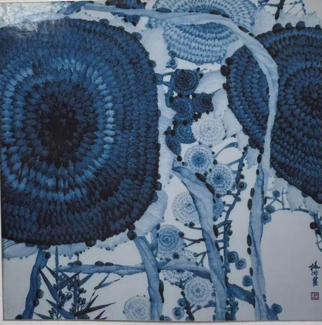 这在她的《向日葵》中体现得淋漓尽致。她强化“分水落笔”,通过青花料色的排布与叠加,塑造出向日葵花盘与叶片如黄宾虹山水般“浑厚华滋”的肌理效果。那不再是单纯的蓝色,而是通过料色的浓淡、笔触的纵横,塑造出的具有球速体育网站明暗、凹凸的立体形态。尤为精妙的是她对“点”的雕塑化运用,那些描绘葵花的“蓝宝石般”的笔触,已从传统的点缀符号,升华为塑造体积、构建画面节奏的视觉单元。它们如同雕塑家手下一个个细小的刻面,层层累积,最终形成一个饱满、坚实、仿佛触手可及的花盘。这种处理,使得她的画面在气韵流动之外,更增添了一份可感的重量与力量。