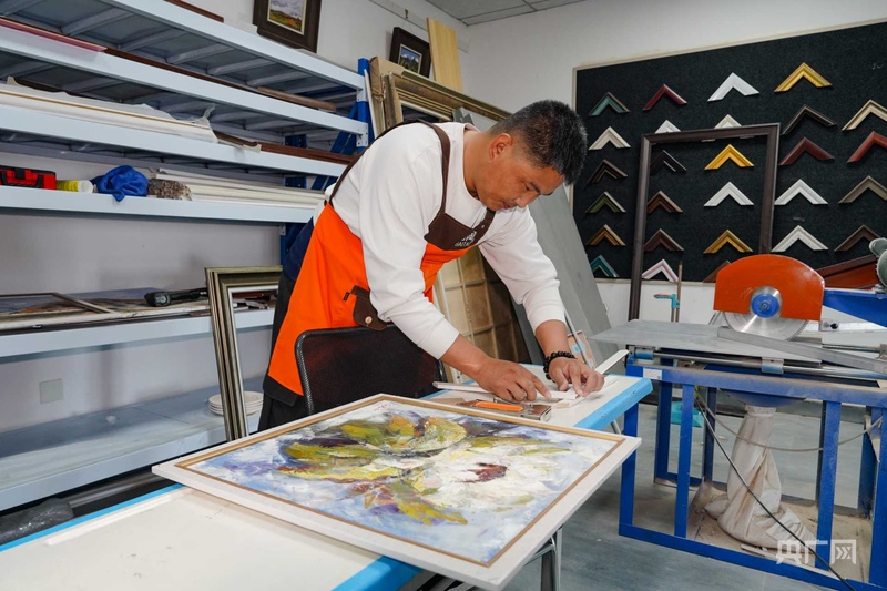 “学生来得越来越多,包装画框的需求也越来越多,谭木匠的入驻让我更新了就业的选择,现在我在这里做学徒两年了,工作很稳定,去年一年做了三百多个画框,今年做的画框更多,下一步我还要学更多木工,让生活越来越好。”吉木萨尔县新地乡小分子美术馆装裱学徒萨其拉图正在小分子美术馆中为油画装裱。