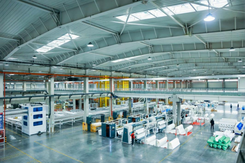后续经喷胶复合封装、围边组合加固结构,紫外线杀菌守护产品洁净卫生,最终由自动包装区以每天2000张的效率完成收尾,全链路以数字化技术定义精度与效率,树立行业智造标杆。