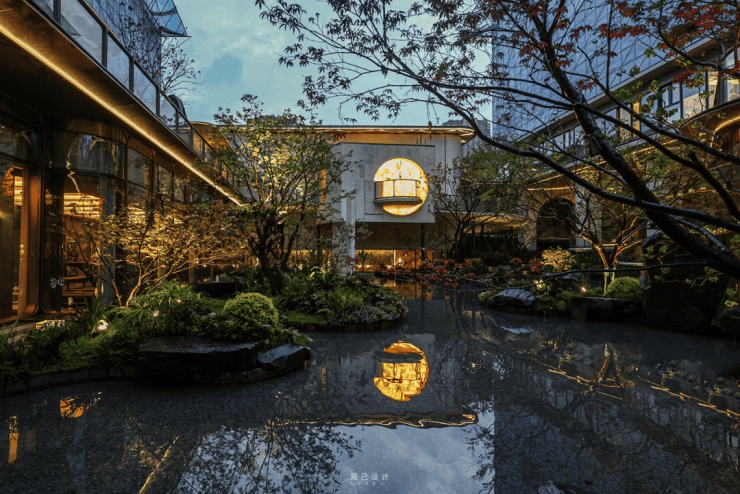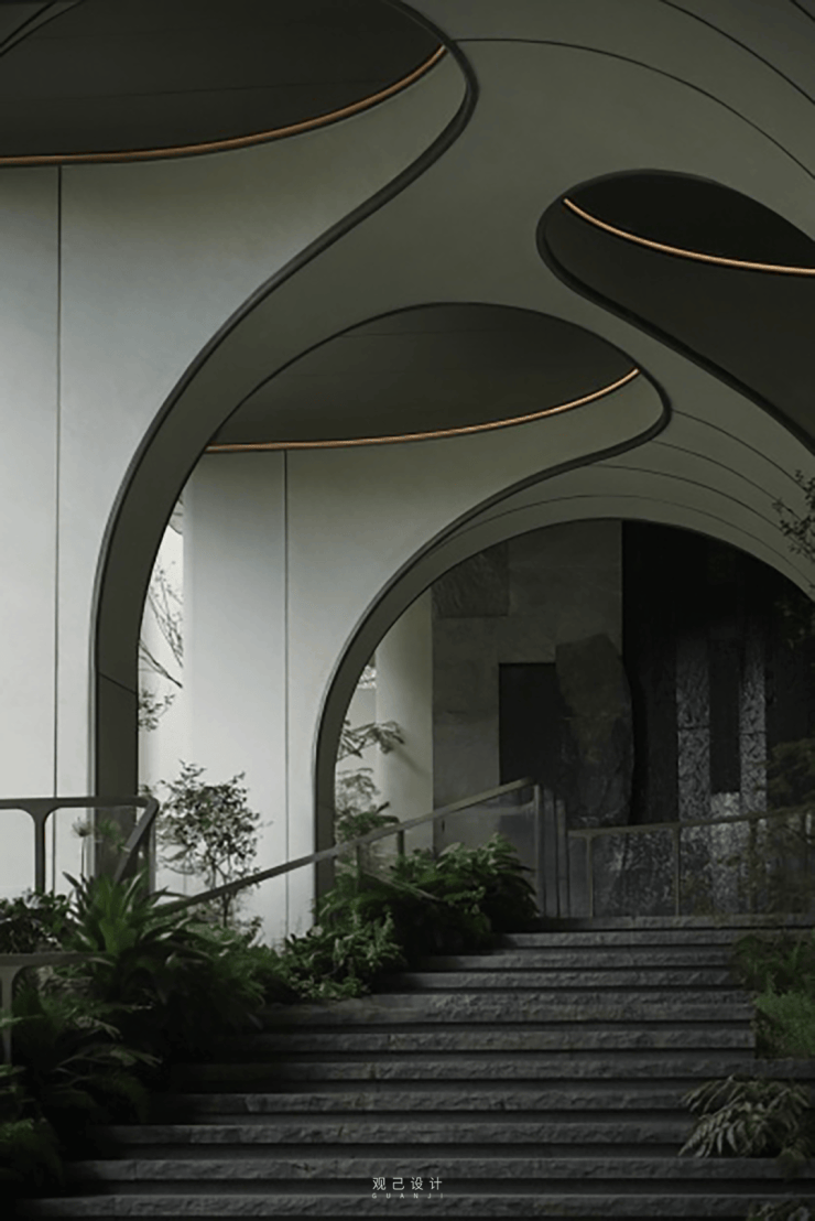 门楼内提取线条与门柱融合,仿佛是一股气韵将屋檐向上托举,提取自苏州砖雕窗花的形态,极致的线条交错下,在摩登感中融入苏州古建特有的灵动韵味.