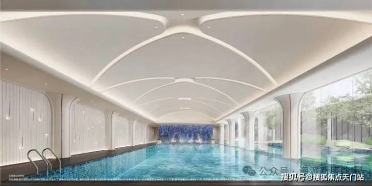 艺术馆般室内无边际泳池,在内部空间设计上,微微拱起的穹顶像云朵漂浮在上空,两侧的柱子成花瓣般的典雅造型,向上延伸,形成独特的记忆点。中央庭院一侧的落地幕墙玻璃,实现自然景观的室内延伸感。泳道尽端的景泰蓝背景墙,更是加强了空间的奢华氛围。