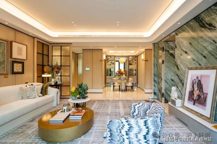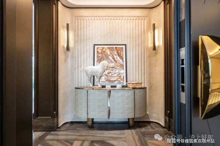 例如入户玄关铺设有“石材皇后”鱼肚印象”,这种级别的奢石在很多顶豪项目中通常仅作局部镶嵌