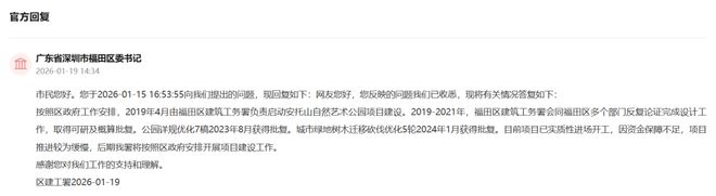 针对上述网友提出的建议,福田区建筑工务署回应表示按照区政府工作安排,2019年4月由福田区建筑工务署负责启动安托山自然艺术公园项目建设。