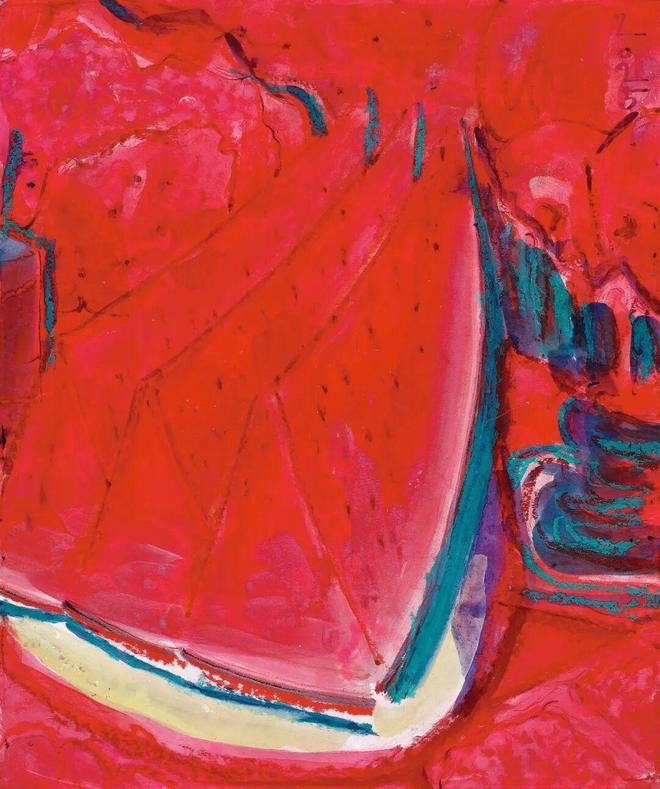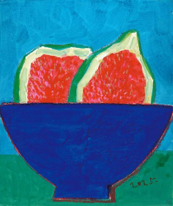 我曾研究石榴这一意象。查阅古代画家笔下的石榴、观察自然中的石榴,还收藏石榴,并且在土耳其、法国等多国发现,石榴因形态暗含生命孕育的意象,在不同文化中都是吉祥符号。但我画的并非单纯作为静物或符号的石榴—— 我笔下的石榴是一种生命感,具有指向性,从形态到色彩都经过自我梳理,形成了有个人特点的符号与表达。如今这个系列愈发凝练,从具体物象聚焦到核心符号,且不断注入对“美丽生活”的定义。