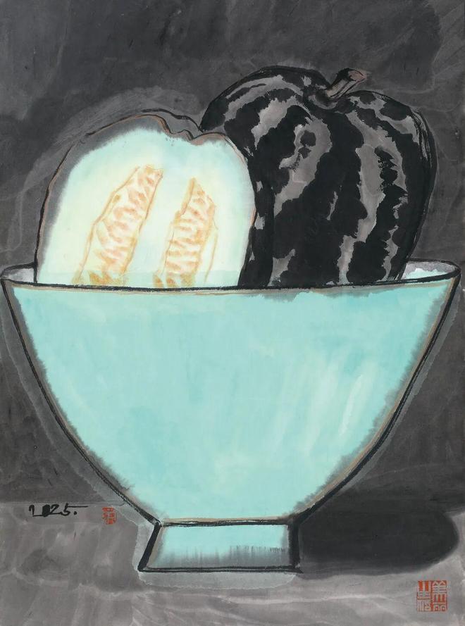 蒋:我绘画的变化多与心境相关,而不是技术内部的考量。我向来凭感性创作,画面风格随心绪变动。疫情期间,我因封闭管理失去了平日的自由,真切体会到“自由价更高”的真意;同时也目睹了人性中丑陋的一面,心境格外暗淡。我只能借作品隐晦记录:延续石榴符号,却画干瘪、病态的石榴,用水墨呈现这份压抑,让“美丽生活”系列承载特殊时期的感受。后来2023年办展,因疫情相关词汇敏感,我为展览加上“有光”二字,暗含我在至暗时刻对人类仍有希望的信念。