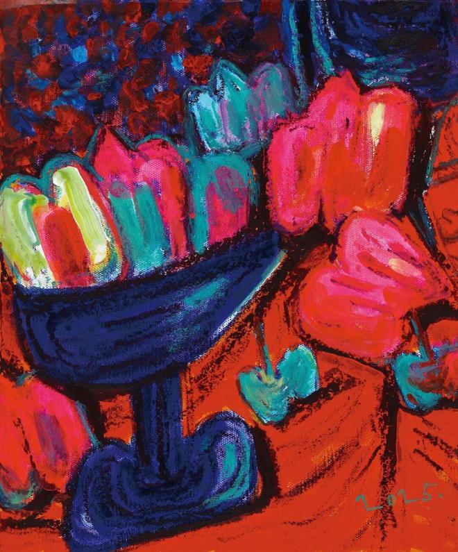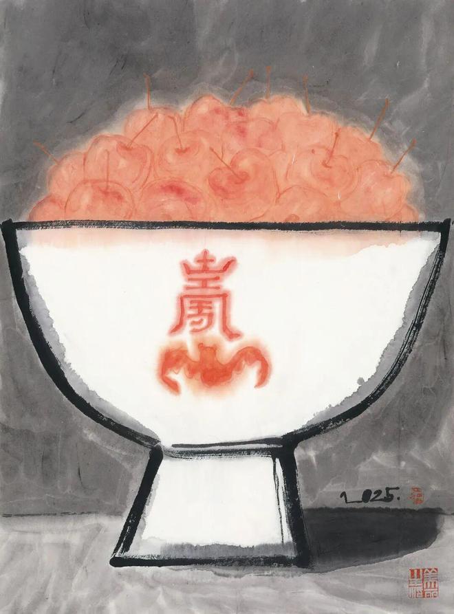 不过我一直在调整画面元素 , 逐渐跳出过去的创作模式:早年画面借人物传递亲情等意涵,还得解读人物关系;之后尝试人物与花鸟、山水结合,但创作手法仍以象征为主;后来意识到绘画应更纯粹,无需依赖文字阐述,索性抛开人物,转而以用桃子、石榴等静物承载主题。让观者通过画面本身感知情感、获得体验,才是回归艺术本体的表达。