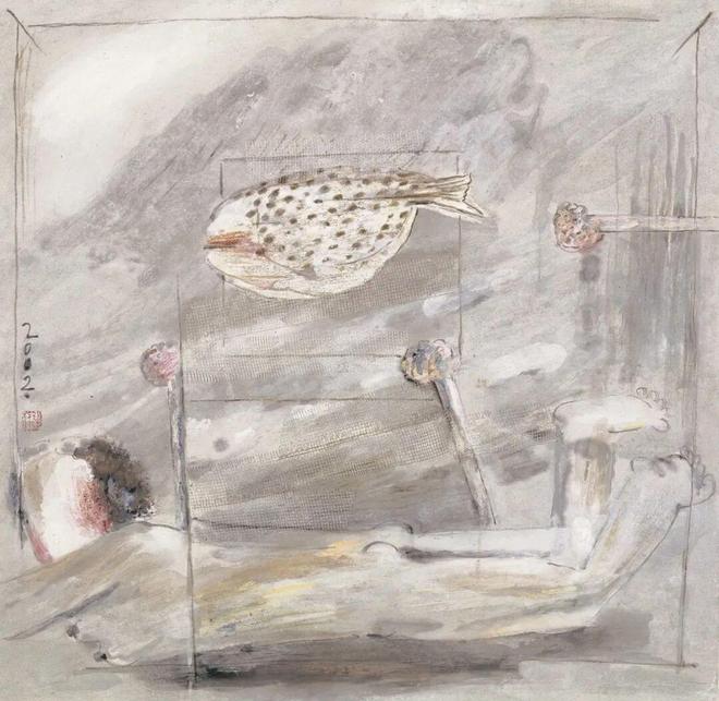 所以,在“文化批判”和“大灵魂”叙述盛行之时,我虽未直接受其牵引,但仍间接地受到时代氛围的渗透。例如在“出山”系列之前,我的创作如“飘幻”“野风”更多聚焦于个人内在的自由与情趣,与社会发展、周围环境关系不大。但随着认知的演变,我逐渐意识到艺术无法自外于社会,不能仅停留于自我情绪的表达。“出山”因而成为一则隐喻,象征着我走出个人封闭的心理状态,试图打破艺术与社会之间的隔阂。这一时期,我也尝试了实验水墨等更具当代性的语言方式,例如使用网拓等非传统媒介手段,探索绘画与观念之间的新可能。尽管我始终保持审慎的创作态度,但在频繁接触理论文本与视觉资料的过程中,不可能完全隔绝时代思潮的间接影响。