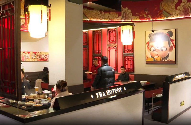 位於冠英古街的吒火鍋負責人胡豆豆介紹,電影熱映為門店帶來了顯著關注度和持續客流,不少客人專程前來體驗,門店為此設計了哪吒主題套餐,讓消費者在品嘗美食的同時,沉浸式感受哪吒文化魅力。