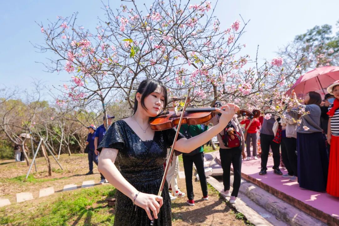 著名歌手李达成携手乐团倾情演绎《月半小夜曲》《凭着爱》等经典曲目,弦乐声与歌声交织,余韵悠长。“在樱花树下听小提琴合奏,还有熟悉的粤语歌,氛围感拉满了!”现场游客纷纷举起手机记录。