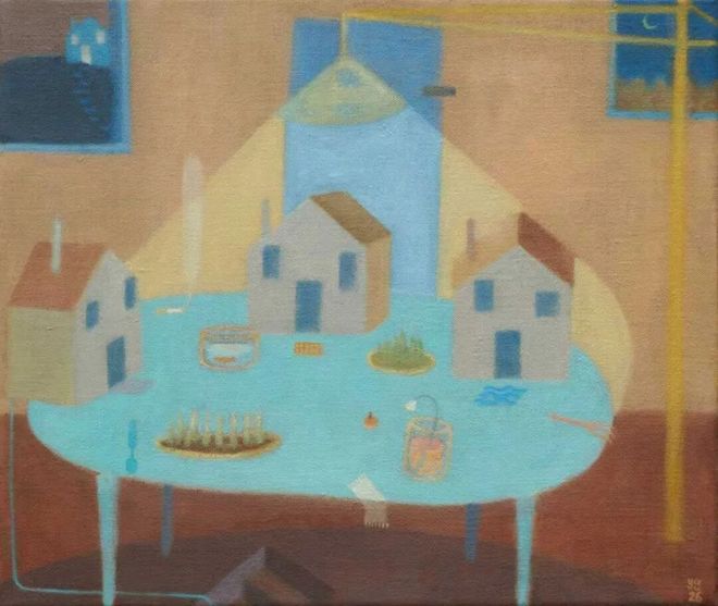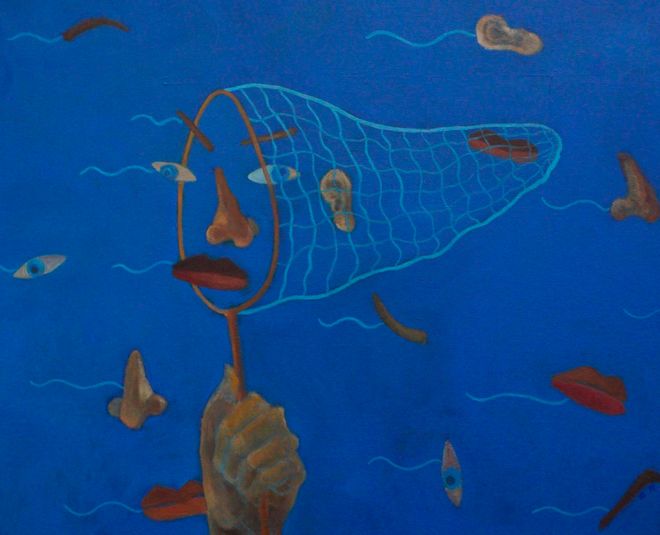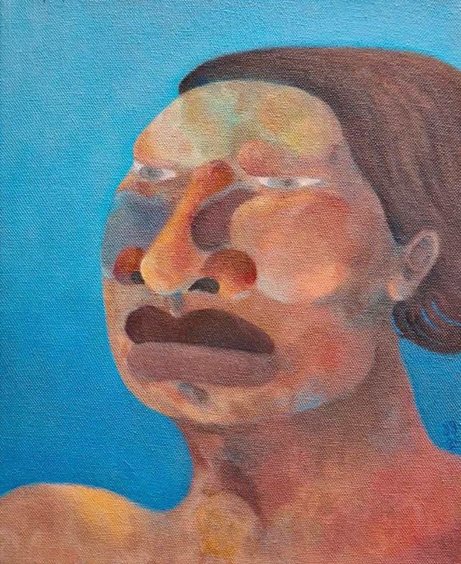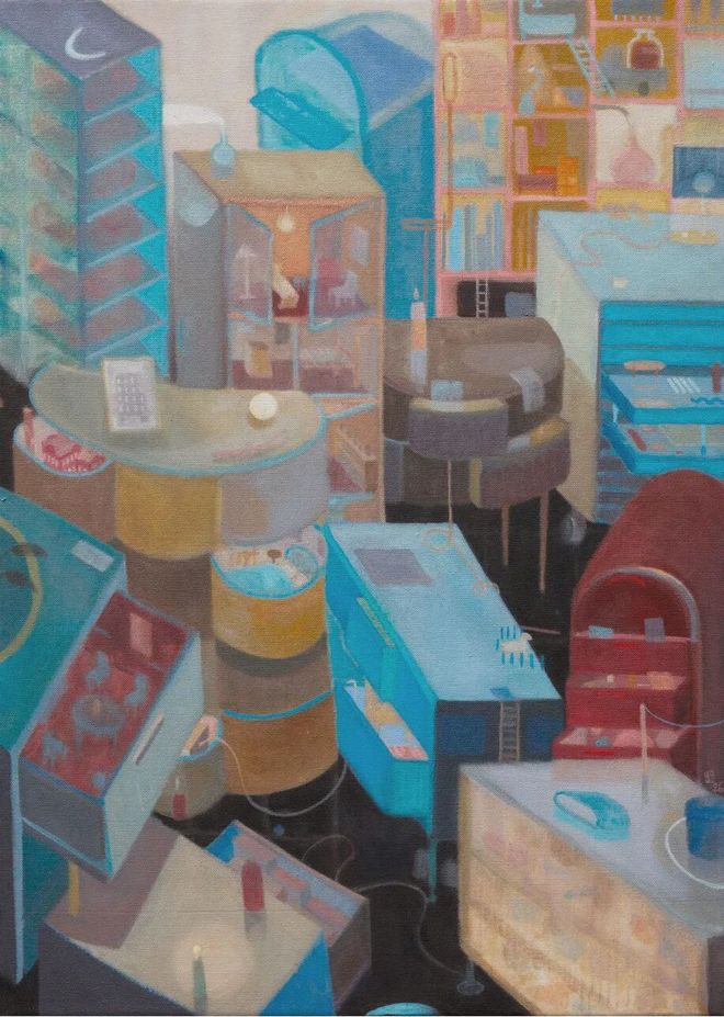 她的图像很少直接来源于现实视觉,而更接近从记忆与梦境中生成的空间结构。梦境在其中发挥着重要作用:记忆在梦中被重新排列,而现实经验也在这一过程中发生偏移。绘画因此成为一种捕捉这种瞬间结构的方式——为那些原本短暂存在的念头寻找具体形态。蓝色构成了这些空间持续存在的气氛。它既像深海,也像宇宙;既像身体内部的流体环境,也带着电子屏幕般的冷光。生命体在这样的空间中漂浮、游动、彼此可见,却始终保持微妙的距离。这种距离既是心理的,也是结构性的:它暗示着当代个体在高度连接的社会中所体验到的某种孤独状态——看似接近、亲密,却始终难以真正抵达彼此。