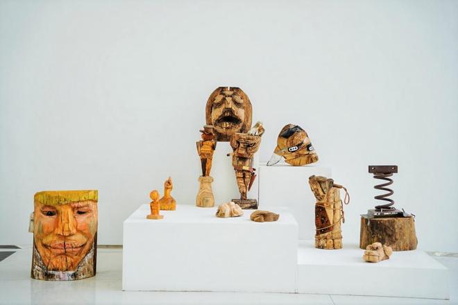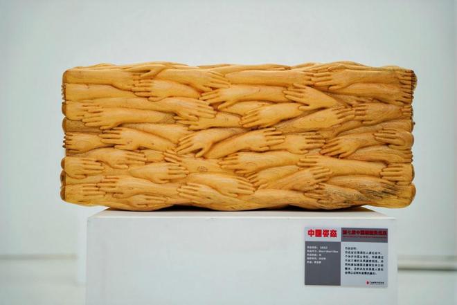 展品《共生》以木雕的语言强调人类社会并非孤立存在,个体之间如木纹般相互交织、紧密相连,共同构建起稳固而富有生命力的整体;《虚幻》系列则顺应木材自身形态,塑造朦胧的梦境自我——精细刻画的面部连接着现实与梦境的边界,攀附其上的微小人物姿态各异,在木质的宁静中悄然揭示了梦境之下的内心复杂与喧嚣。