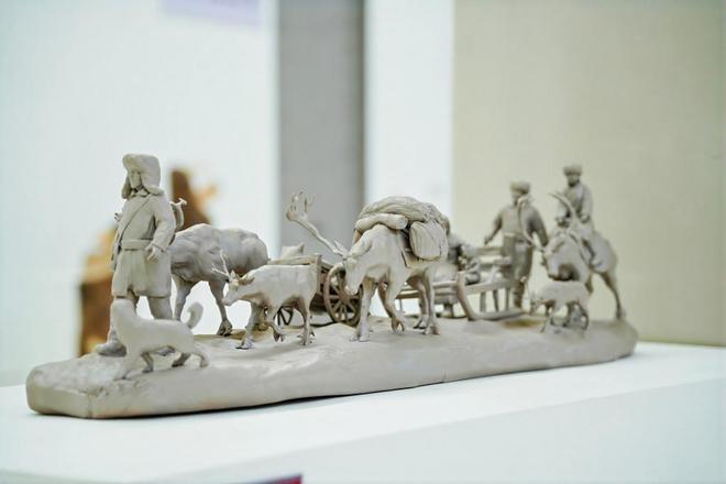 雕塑《额尔古纳河韵——迁徙之歌》展现鄂温克族迁徙,赞其历史文化及人与自然和谐,彰显坚韧勇往精神。