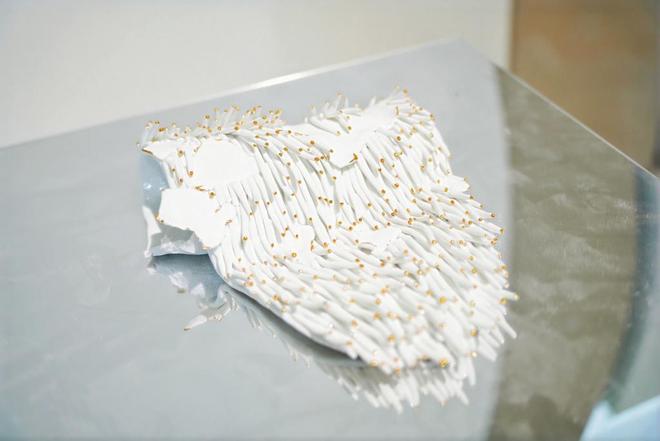 陶瓷材质同样在展览中扮演了重要角色。在当代雕塑创作中,它已从传统的实用器皿与造像功能中解放出来,成为一种被艺术家灵活使用的媒介。艺术家们以陶瓷的易碎性与永恒感、温润釉色与粗砺胎体之间的审美张力来探讨传统与当代的辩证关系。展览《燎原》以陶土厚底寓华夏大地,白色绒毛触须似星火蔓延,深色斑点喻示新生。