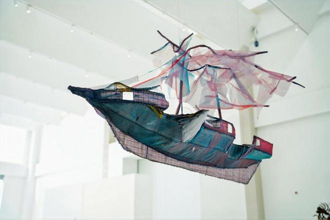 此外,展览中还大量出现了纸浆、废旧报纸、纱布等媒介——《叠山》将废弃纸箱转化为纸浆,塑造成山水意象;《愚人渡》灵感源于福柯“愚人船”,以铁丝、水纱为球速体育Welcome材,针脚细密相接,船身虚实起伏。