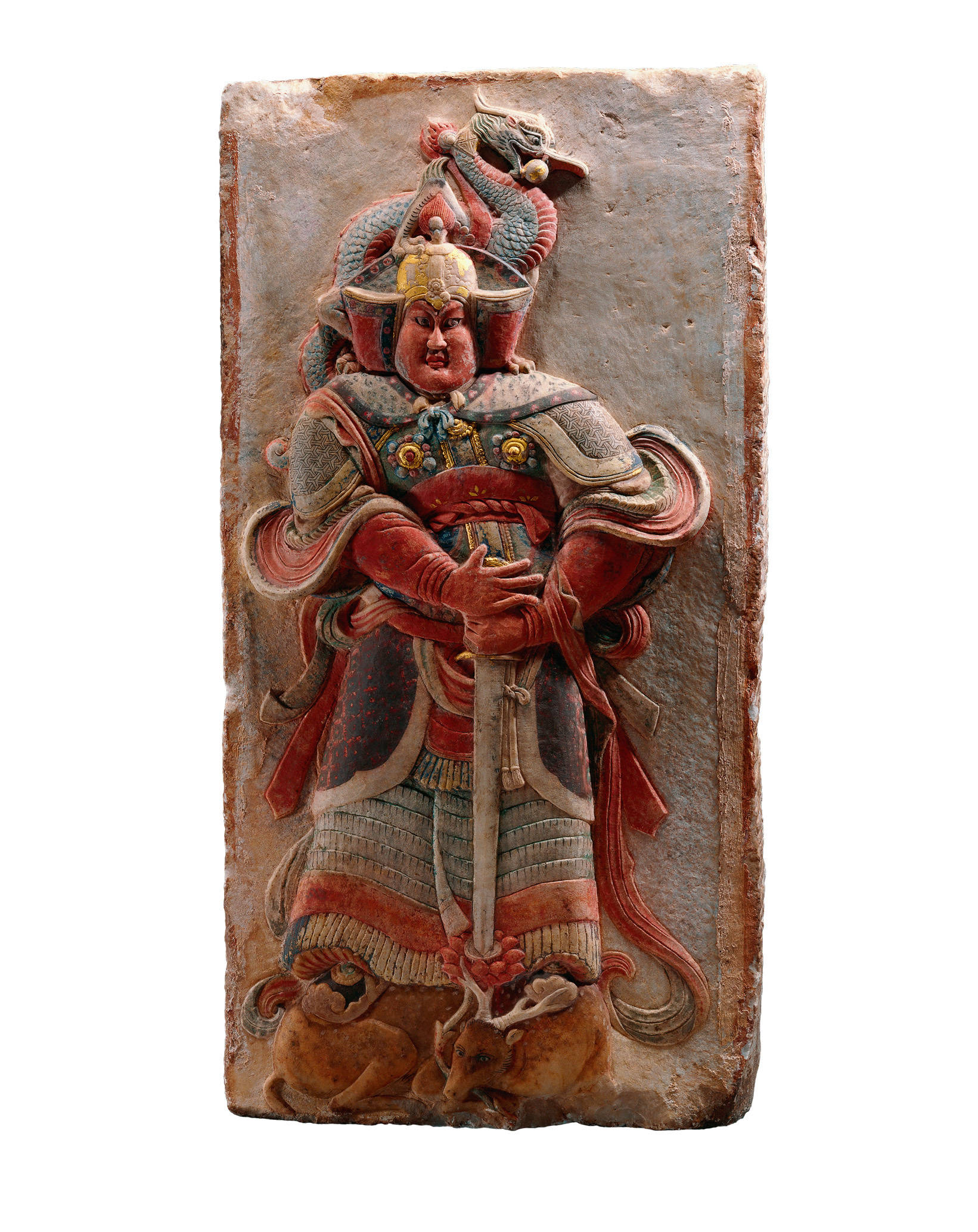 值得注意的是,此次展览中还展出了一件别名“海归天王”的彩绘武士浮雕石刻。浮雕武士像为一球速体育Welcome对,是五代时期义武军节度使王处直墓甬道两侧的武士雕像。这对石刻目前均藏于中国国家博物馆,一件武士雕像(肩立凤鸟,脚踩卧牛)于2000年出现在佳士得美国纽约拍卖会,经中国政府多方交涉,最终将其归还中国。另一件武士雕像(肩立青龙,脚踩麋鹿)由美国收藏家安思远先生捐献给中国。