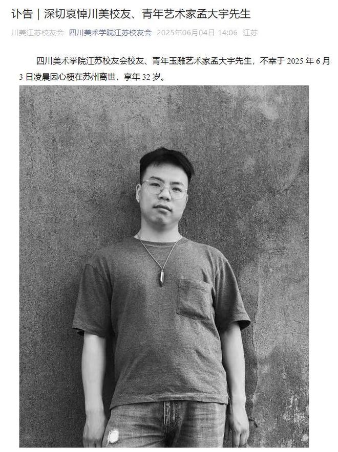 6月4日,四川美术学院江苏校友会对外发布一则讣告,该会校友孟大宇不幸离世,年仅32岁。