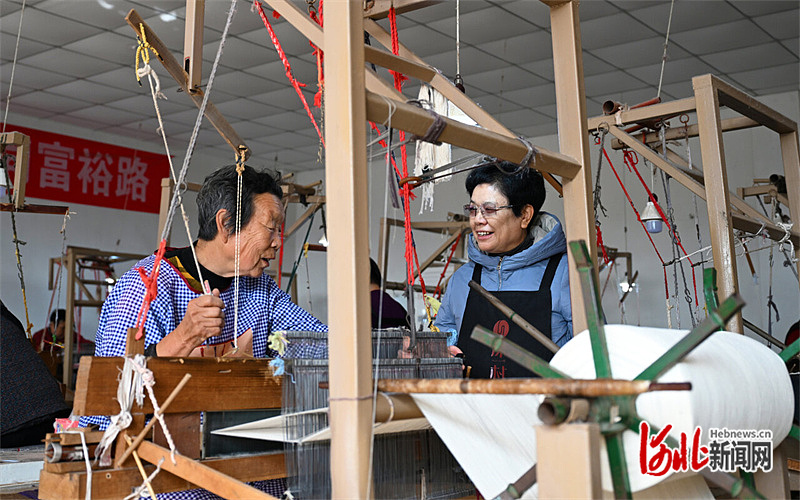 “哐当、哐当……”11月8日,在石家庄市赞皇县原村土布专业合作社创新研发基地的非遗工坊内,机杼声声。原村土布纺织技艺第三代传承人崔雪琴和90后女儿仇莎正在和几名织娘研究样布:“这布吸汗透气、健康环保,一摸就能感受到棉花的温度。”