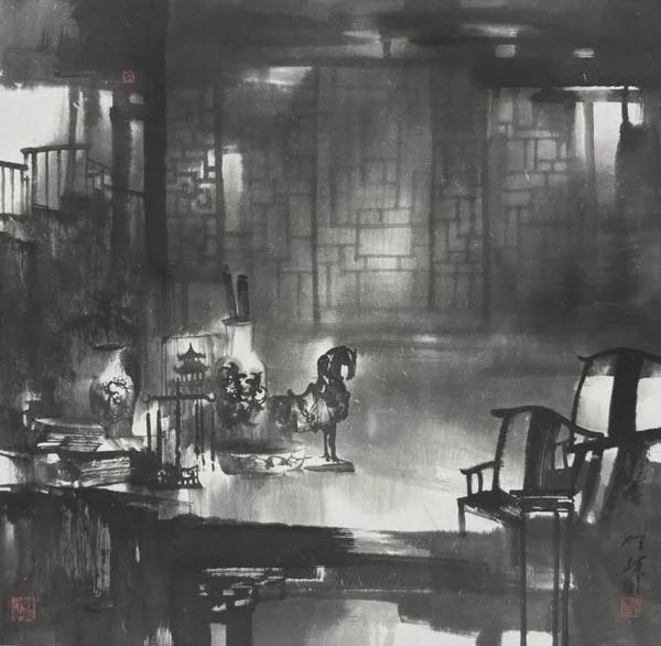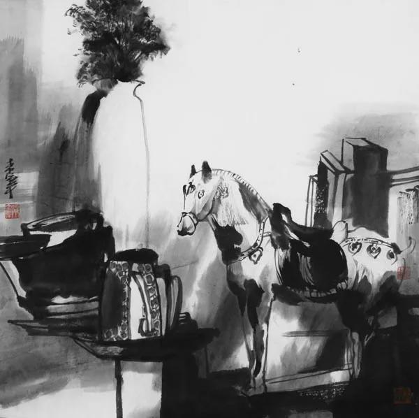 这幅水墨作品中,氤氲的墨韵与灵动的光影间映衬着立马的静默姿态。数个春秋的无声守候,仿佛在传递着不屈与刚健、傲骨与坚守的品格,凝练成自强不息的永恒瞬间。老宅时空中生命意象与记忆温度的承载,光影交错与岁月回响的定格,构建了传统东方雅韵与现代笔墨表现的时空叙事,记录着文化的厚重与时光的痕迹,诠释着对“以形写神”命题的诗意升华与精神重构。