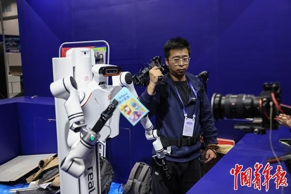 3月27日,北京,首钢园,工作人员演示realman具身双臂升降机器人模拟人类抓取动作。本文图片均由中青报·中青网记者曲俊燕拍摄