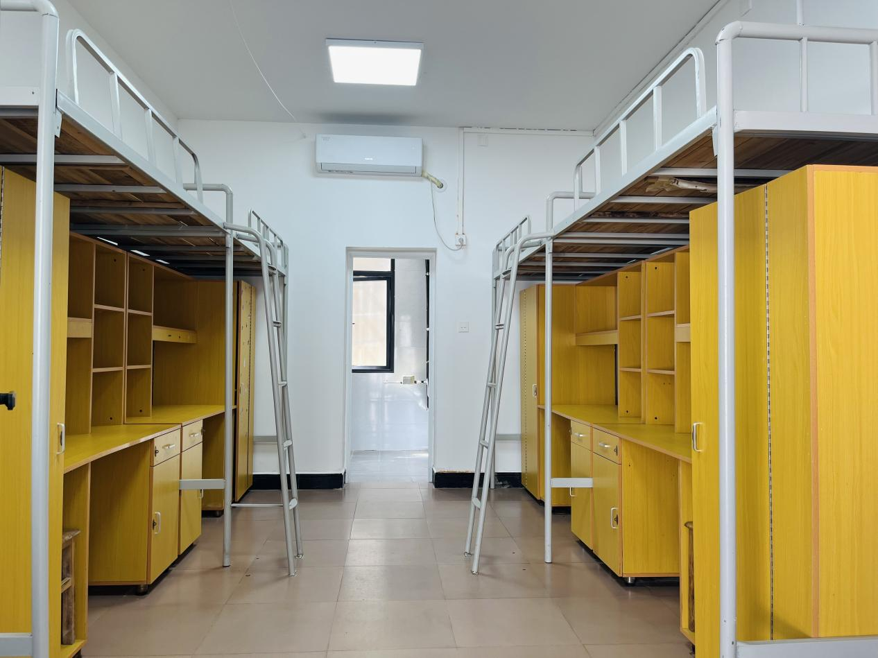 她所住的7栋,暑假期间进行了全面翻新、改造。墙面粉刷,木门换成铁门,窗户、卫生间翻新,吊顶灯、空调换新。更重要的是,原来是6、8、10人一间,现在是中间宿舍4人间、两头5人间。据了解,学院大部分教职工、学生宿舍都翻新了,居住舒适度会有明显提升。