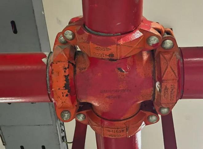 审核审计结算报告显示防水卷帘门更换了27樘,但每经记者在地下车库注意到,部分消防卷帘门没有标牌,部分有生产厂家但没有新装的痕迹,仅部分卷帘门更换了控制器。消防管道、消防泵等并不是换新后的材料,只是表面被刷了红漆或蓝漆。