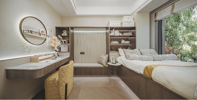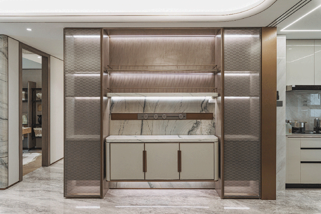在交付配套之中高阶定制餐柜空间,提供更多收纳空间之外,也增加空间视觉层次。保利海上臻悦售楼处电话:☑☑