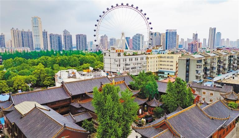 6月22日拍摄的淮河路步行街古教弩台景点,古朴的建筑和不远处的“庐州之眼”摩天轮遥相呼应。