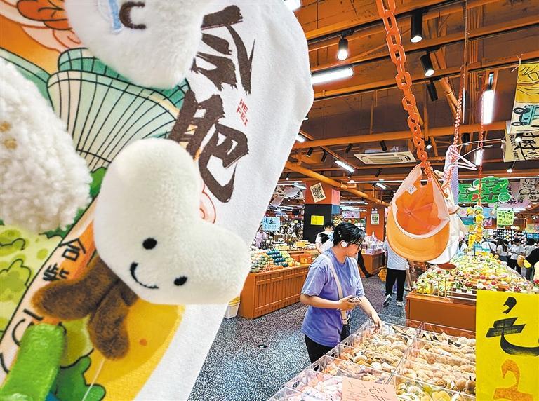 6月22日,淮河路步行街两侧的店招鳞次栉比,鲜艳亮丽的国潮配色成为街区一道美丽风景线日,淮河路步行街一商店,琳琅满目的文创商品吸引游客前来选购。