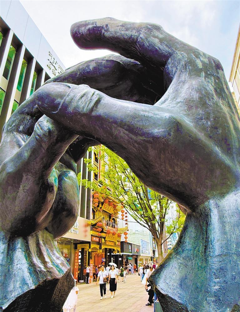 6月22日,淮河路步行街上的雕塑《吉》,用中国传统的拱手礼向市民游客送上祝福。