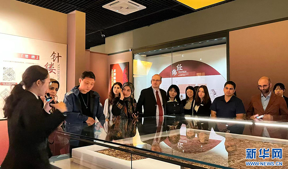 外国青年边参观,边思考。“为什么在古代,会有这么多竹简被埋进墓中?甚至一般人的墓中也会有竹简?”有外国青年发问。“竹简是先秦至魏晋时期的核心书写载体。这说明中国人在古代就注重学习,希望死后也能与书籍为伴。”赵阳的话让大家露出会心的笑意。“为什么这边的纺织品上绣的都是鸟类,那边绣的都是花草?”“这两种纺织品是不同时期的。这说明在中国古代,不同时期的人们审美是不一样的。”“是的,是的!”赵阳的话引得大家一阵大笑。