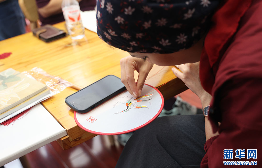 当天,外国青年还来到荆州市楚绣坊,体验楚绣技艺。大家不分男女凑在一起,在荆州市民间刺绣传承人汪宣珍指导下,穿针引线绣了起来。