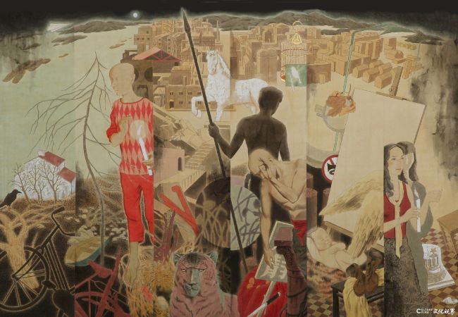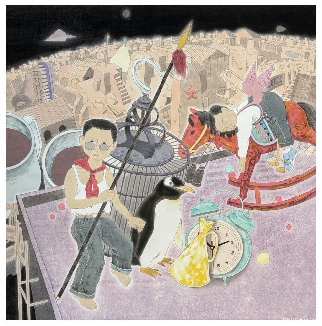 他以工笔重彩为针,在绢素的经纬间绣出历史与梦境的双重镜像。那些身着传统服饰的岭南先贤,在他的笔下从泛黄的文献里走出,与炮车、典籍、雄狮共同站成震撼的视觉史诗。矿物颜料的浓艳在细腻线条的牵引下,让历史的庄重与艺术的浪漫温柔相拥,每一处敷色都似在为历史人物的精神世界晕染底色,让“敢为人先”的地域品格在画面里有了可触的温度。而另一幅满是奇幻意趣的作品更如一场瑰丽的梦:戴红领巾的孩童与企鹅并肩,旋转的木马在都市废墟的背景里悠悠转动,工笔的精致包裹着荒诞的叙事,金箔的点缀如时光的碎屑在画面闪烁,在“童年梦境”的表象下,藏着对城市变迁中个体精神境遇的深切观照。这种“以工笔写奇幻”的创作,是对传统技法的当代解构,让观者在工笔的丝缕间,解码历史与现实的隐秘对话。