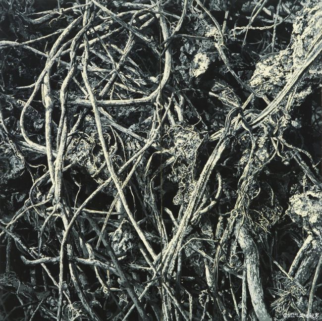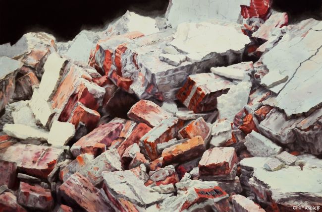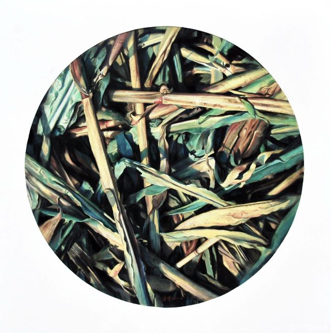 转身入了油画的疆域,他又化身为微观世界的诗人。那些堆叠的红砖废墟在油画的语言里,成了时间的立体档案——每一块砖的裂痕、每一处色彩的斑驳,都被写实的技法放大成时间的指纹,红色的炽烈与灰色的沉寂在画面里拉扯出强烈的视觉张力,黑色的背景如幕布般将废墟的沧桑推至眼前,似在轻声询问:你可曾留意过城市更新中,那些被推土机碾过的记忆?而圆形构图的秸秆系列则是另一番诗意景象,秸秆的交织线条如命运的缠结,在油画厚重的笔触里,平凡的植物肌理升华为生命轮回的图腾。他曾以生机的诠释对自然的敬畏,如今又以废墟的沧桑叩问文明的肌理,两种创作在“微观叙事”的维度上遥相呼应,让每一处笔触都成为对“生命如何在荣枯中永恒”的视觉应答。