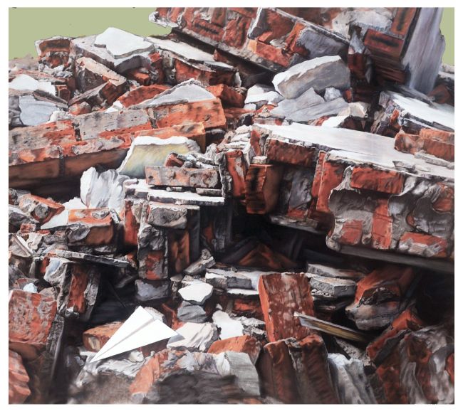 水彩的清透与色粉的柔润,是他为时间与记忆定制的双重视觉滤镜。红砖废墟在水彩的晕染下,有了湿润的呼吸,纸飞机的洁白与砖块的红灰形成明快的对话,把拆迁的阵痛化作一曲温柔的叙事;色粉画中的秸秆与秋意,以柔润的质感捕捉自然的褶皱,暖色调的层层叠压让季节的韵律凝固成视觉的诗行。水色的灵动与色粉的绵密,让历史题材在透明与厚重的交织中有了别样的诗意。于他而言,媒介从不是表达的桎梏,而是思想的延伸,水彩的清透、色粉的柔润,都成了他叩问时间、留存记忆的独特语汇。